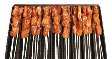 Marinované kocky z kuracích pŕs samostatne napichnuté na troch bambusových špajdliach, ktoré tvoria dokopy jeden špíz.